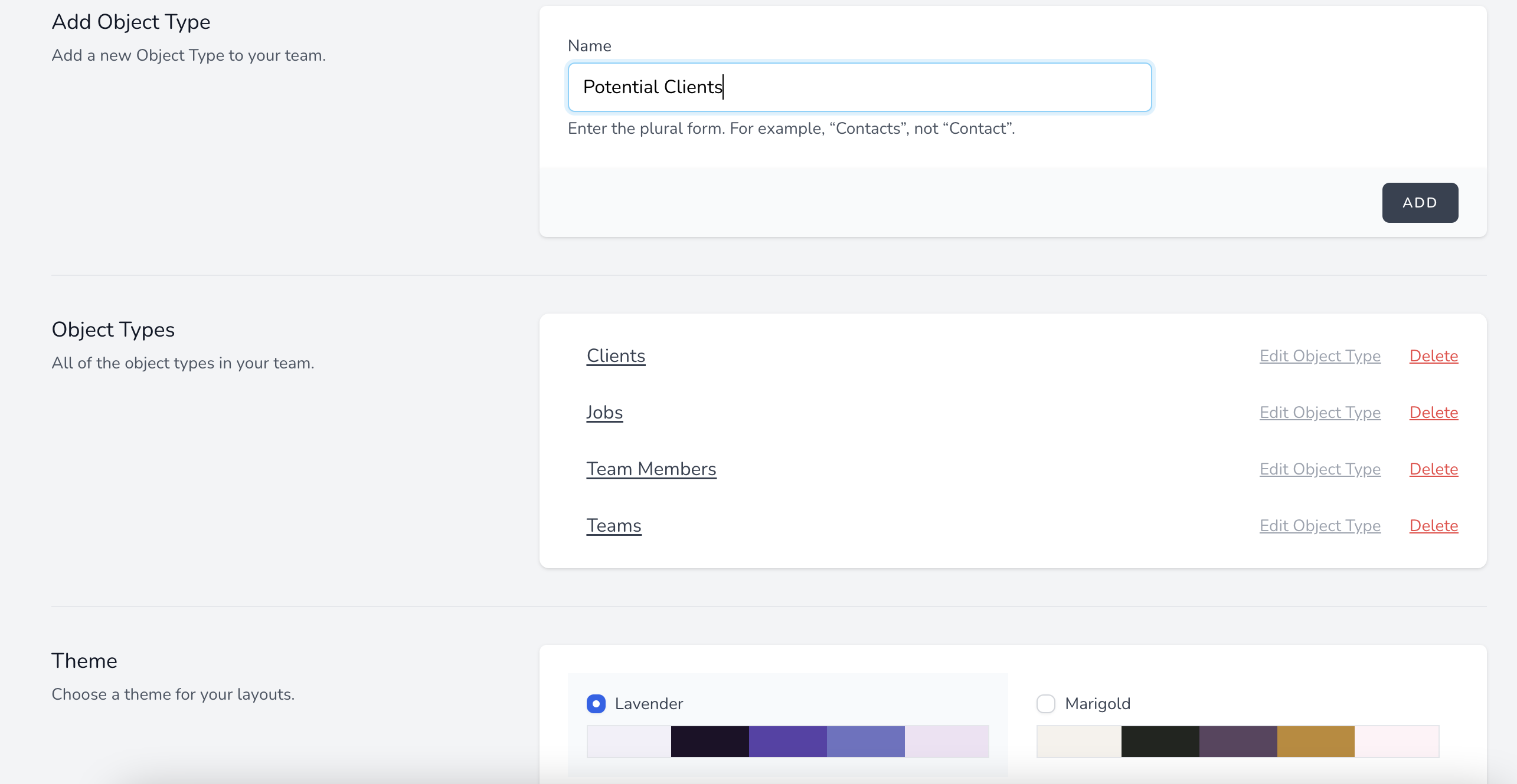 On the application building side, users can easily add, edit, or delete object types and add a theme for the layouts.