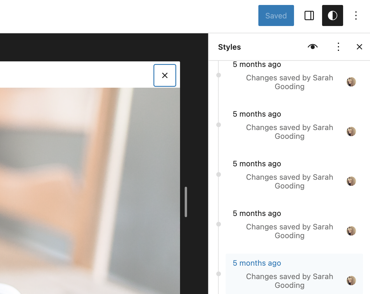 Revisions for design changes have landed in 15.8 with a basic UI inside the Global Styles panel. It shows a timeline of saved changes along with who made the change, so users can easily revert back to previous design changes. This creates an extra cushion or safety net for those who are designing their own sites and should provide a greater level of user confidence when making design changes.