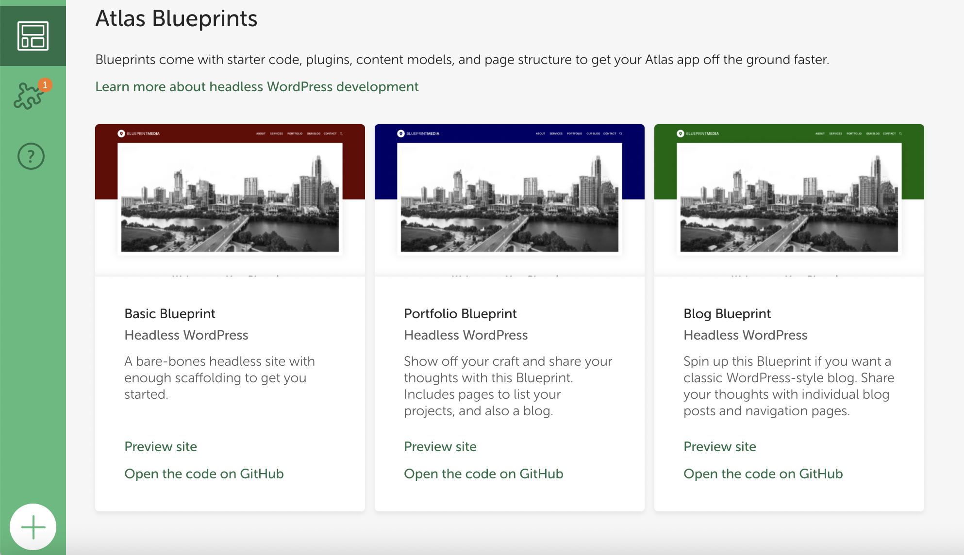 The Atlas add-on gives users access to three blueprints that include starter code, plugins, content models, and page structure to jumpstart site development. One creates a barebones site with just the scaffolding necessary to get started. The second blueprint is for a portfolio site and includes a blog and pages to list projects. The third blueprint appears to be very similar but just includes a blog and menu with no portfolio.