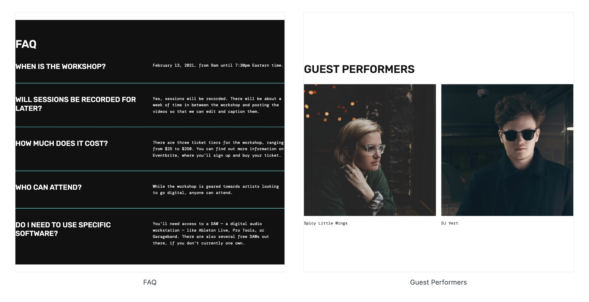 Not pictured in the demo is a full-width FAQ pattern with a dark color scheme, which matches the other quirky design elements in the theme.