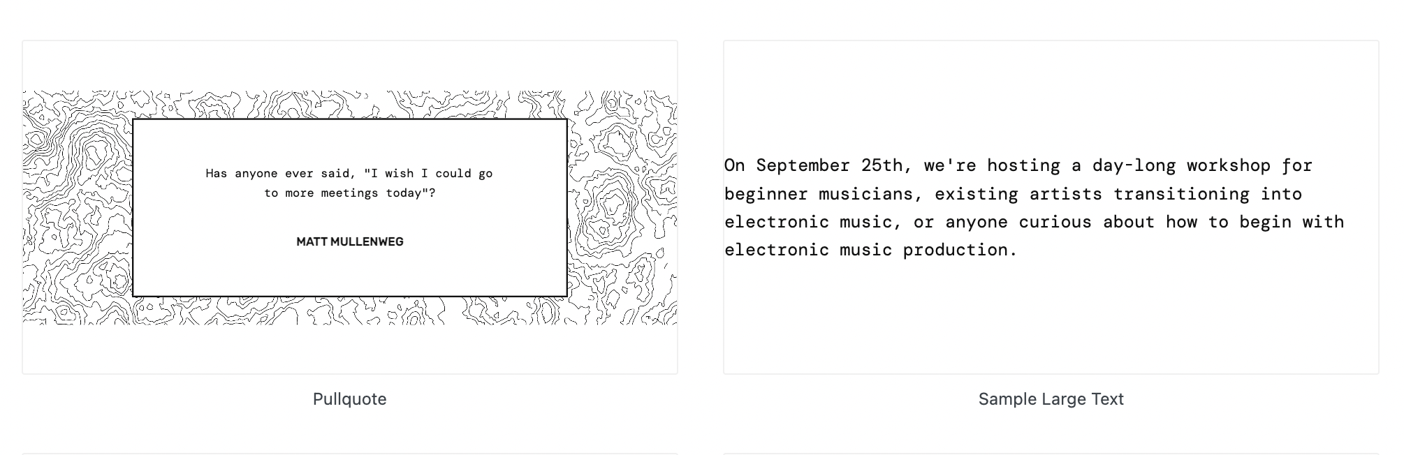 In addition to the instructors pattern and pricing table shown in the demo, Loudness includes artistic designs for a pullquote pattern and a section of large text.