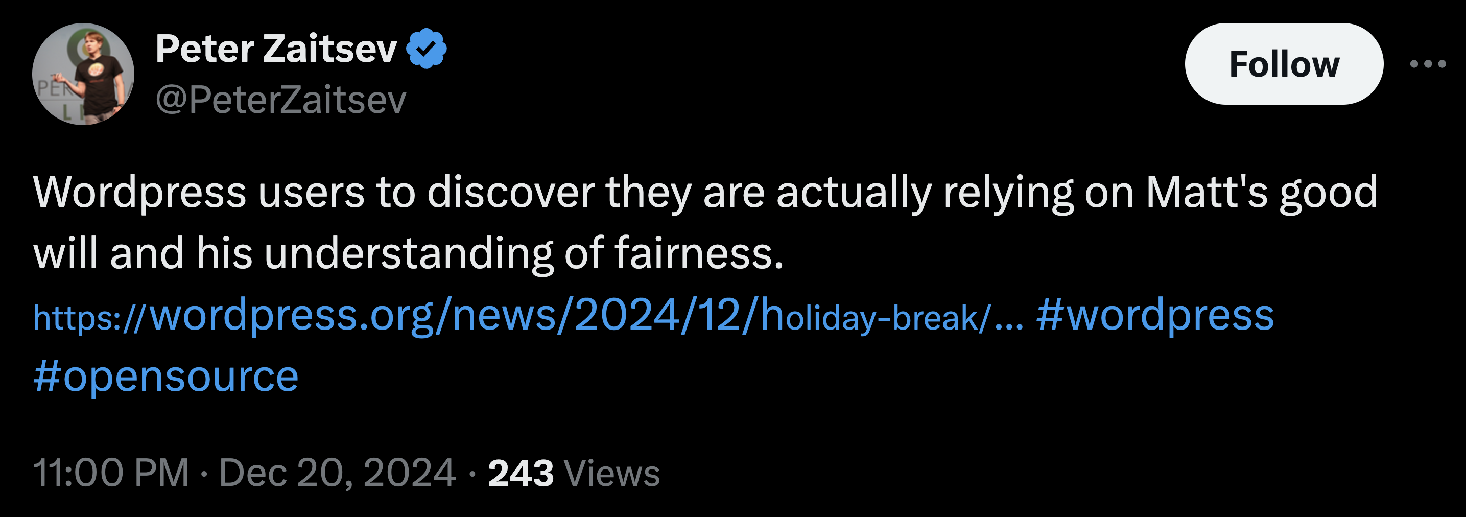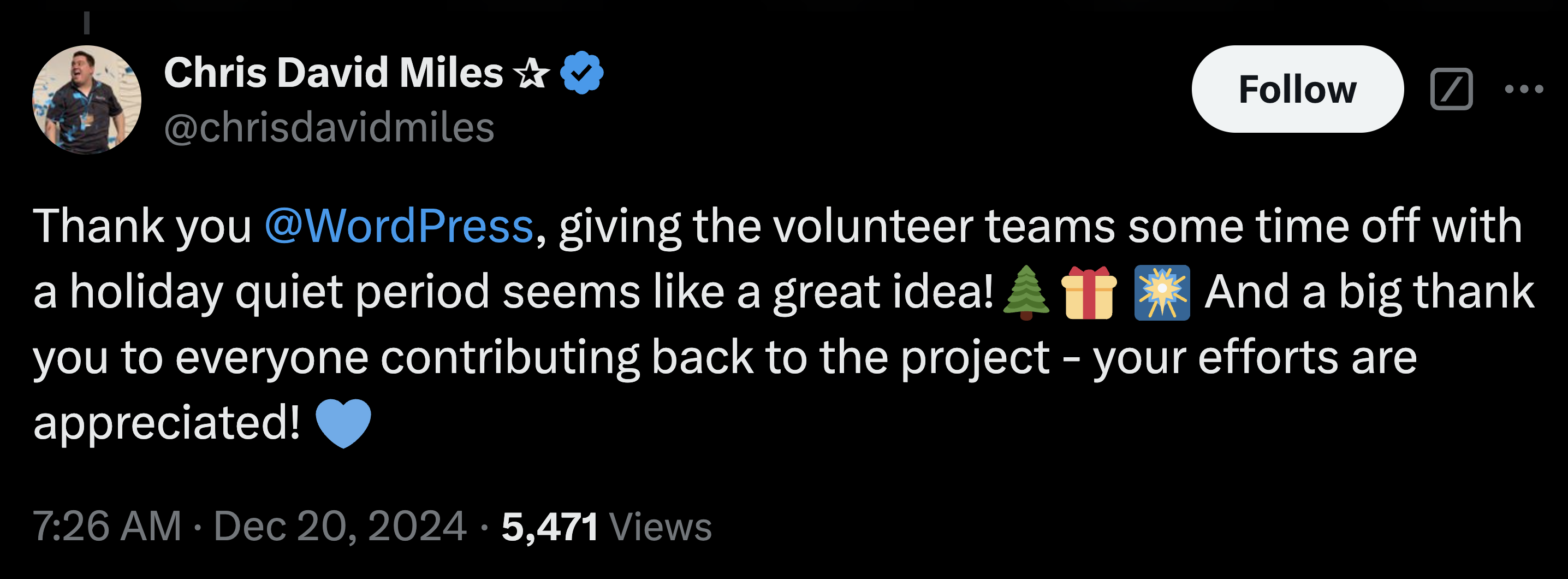 The official WordPress Twitter account echoed the announcement: “In order to give tired volunteers around WordPress.org a break for the holidays, we’re going to be pausing a few of the free services currently offered…And to be super clear for the court so we’re not held in contempt, none of this applies to @wpengine.”