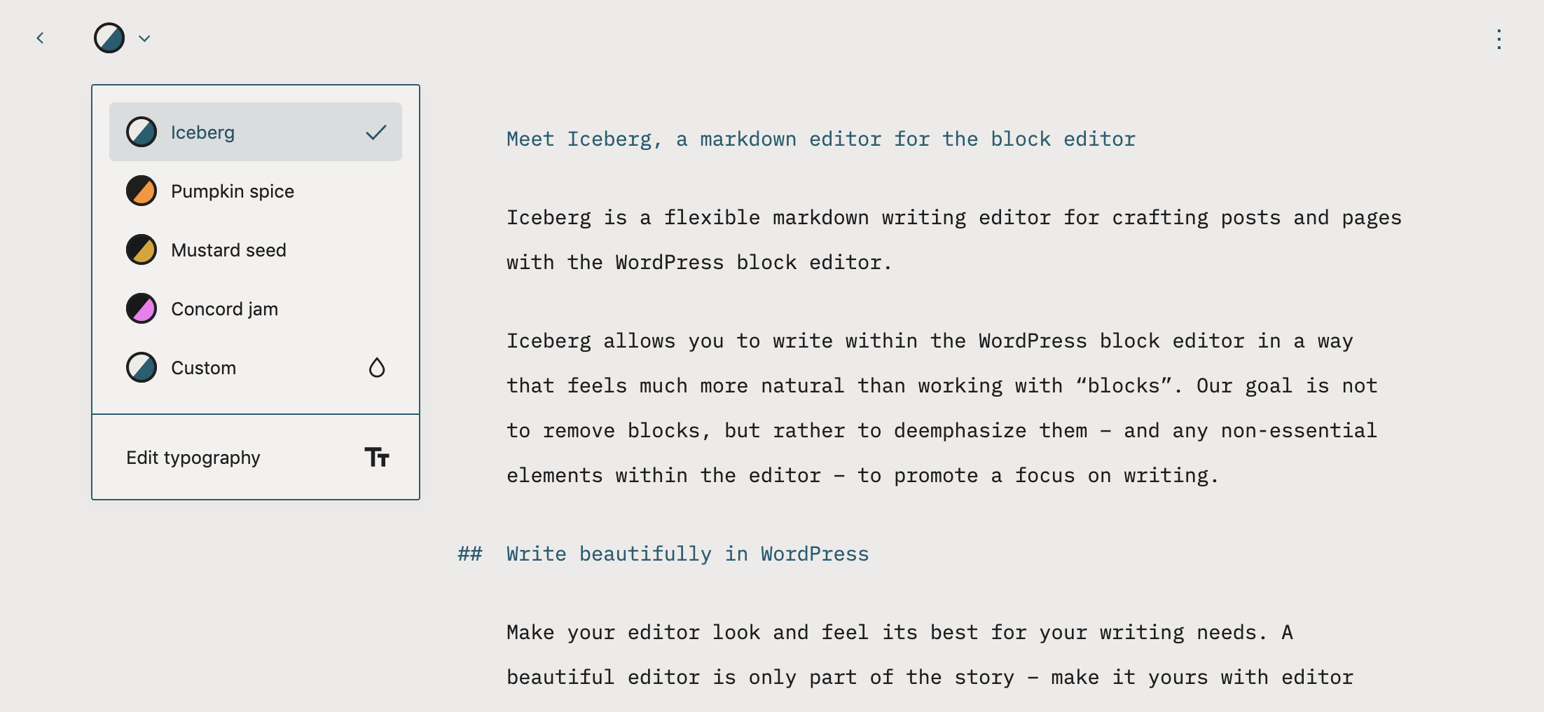 Iceberg features a minimalist editor with four color themes, the ability to create a custom theme, and a set of typography controls. In switching to Iceberg, there is not much missing much from the default block editor that would be necessary for writing. Users can drag and drop media into Iceberg and the backslash command works to trigger the block inserter. It also includes a Table of Contents, word and character counts, reading time, keyboard shortcuts, and support for emoji.