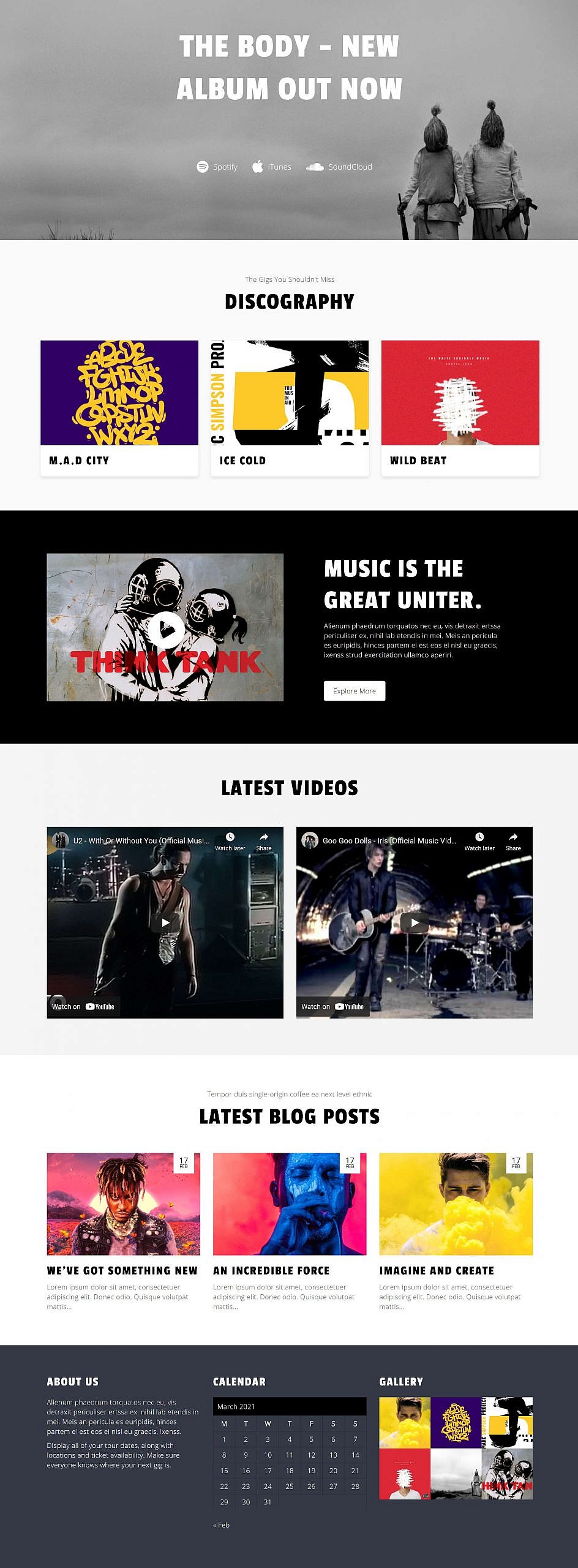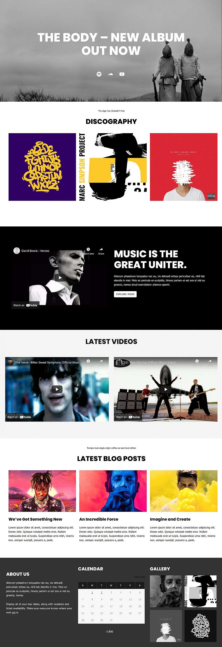 The following is a comparison of the original Music Artist theme homepage (first) and a recreation using blocks via the Ariele Lite theme (second):