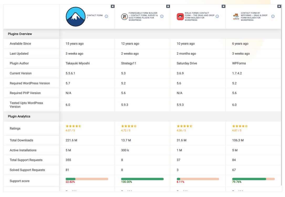 Several major plugin categories where multiple plugins are competing against one another are good candidates for comparison using the WPPC tool, including e-commerce, SEO, analytics, social sharing, performance, block libraries, forms, and security, to name a few. Plug in a few of the top contenders and it’s easier to see at a glance how they compare in terms of popularity, maintenance, and support.