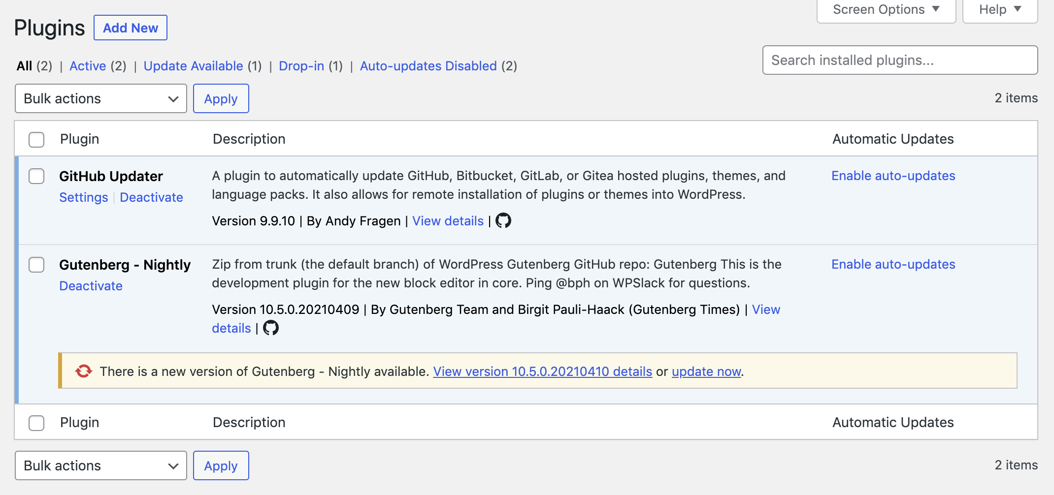 I set up a Gutenberg testing environment in 2 minutes using these plugins. Please note that it’s not recommended to use Gutenberg Nightly in production.