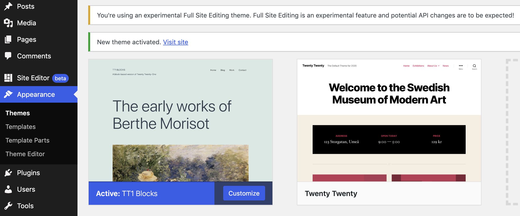 Testing the full-site editing project will require you to install a theme like TT1 Blocks, which has support for the experimental feature. Once you do, you will see the “Site Editor (beta)” menu item in the dashboard.