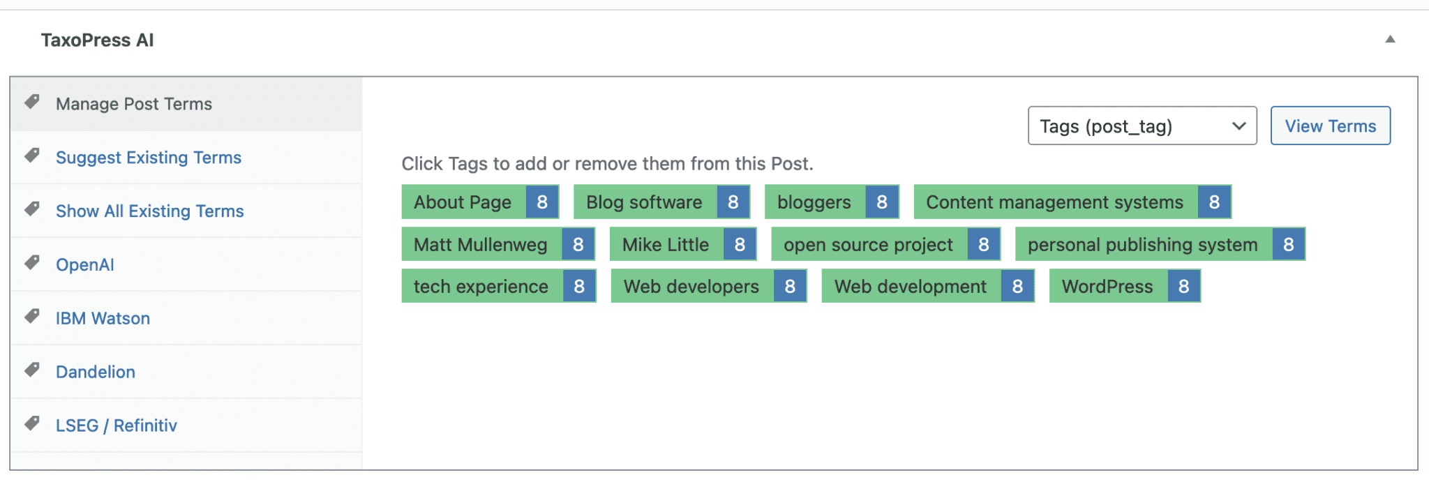 TaxoPress, a plugin that allows users to create and manage Tags, Categories, and taxonomy terms, has joined a growing number of WordPress products using AI to innovate and enhance user experience. The latest release adds support for OpenAI and IBM Watson to auto-detect the best taxonomy terms for content.