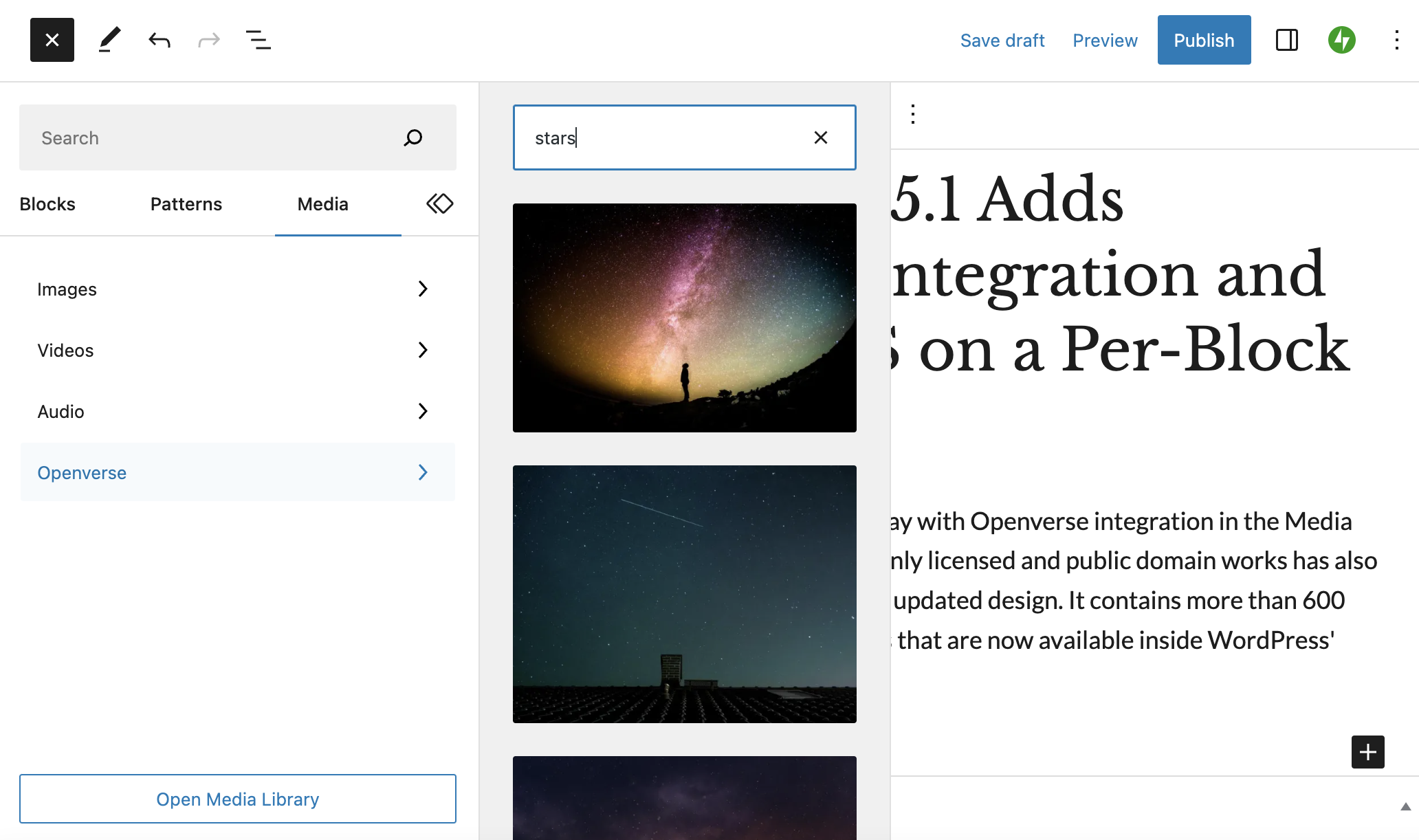WordPress 6.2 also adds integration with Openverse to this new media tab. Users now have access to the Openverse library of more than 700 free-to-use openly licensed and public domain works, directly inside the editor. Clicking on an Openverse image will instantly insert it as an Image block with the proper attribution and license automatically added to the caption, a much faster experience than downloading and uploading to the Media Library.