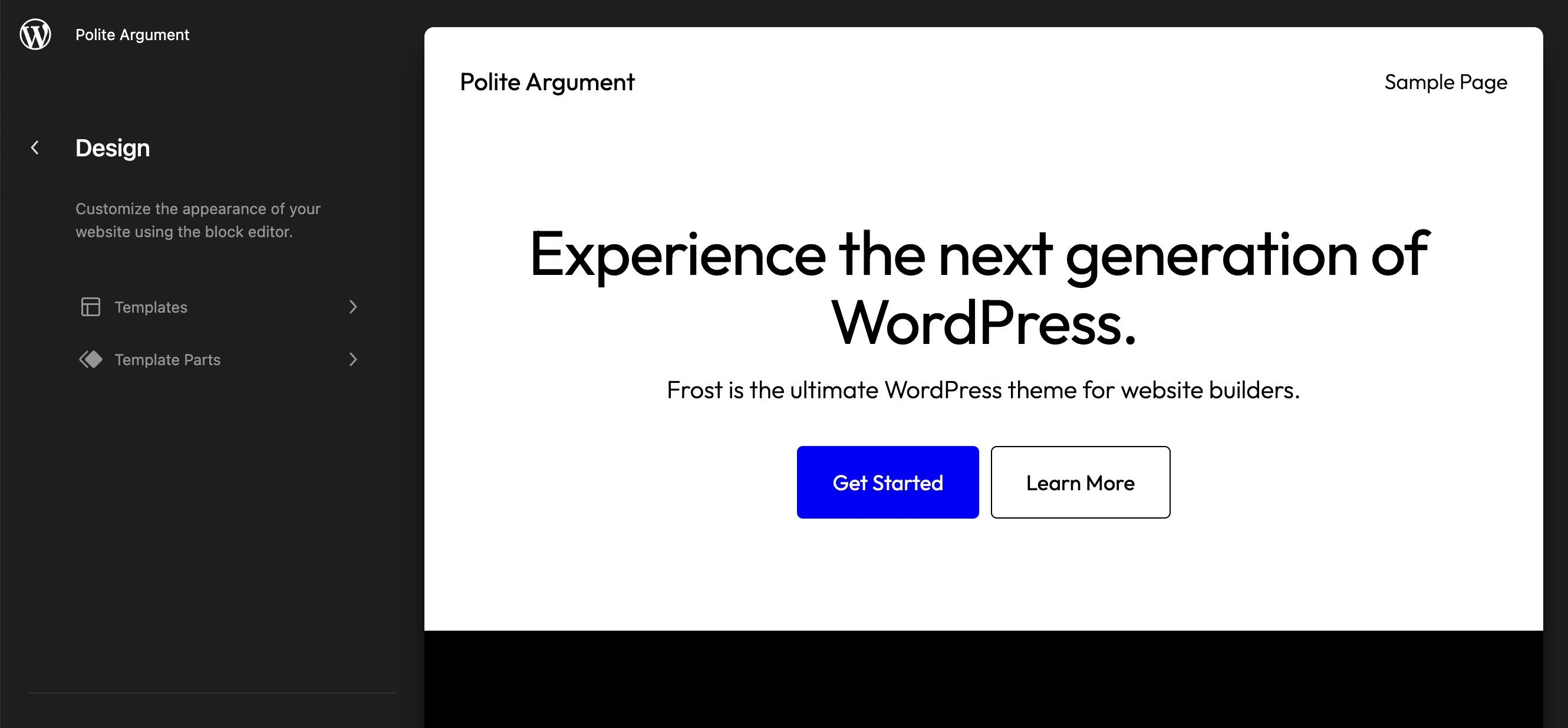 When first installing the theme on a new WordPress site, clicking Customize takes the user to the Site Editor with the homepage template pre-filled so there’s no guesswork involved. Users can immediately start customizing any of the included templates. Frost packages all the usual ones – 404, archive, home, index, page, search, and single, but also includes a blank template and a “no title” template to help users with content that works better without the requirement of a title.