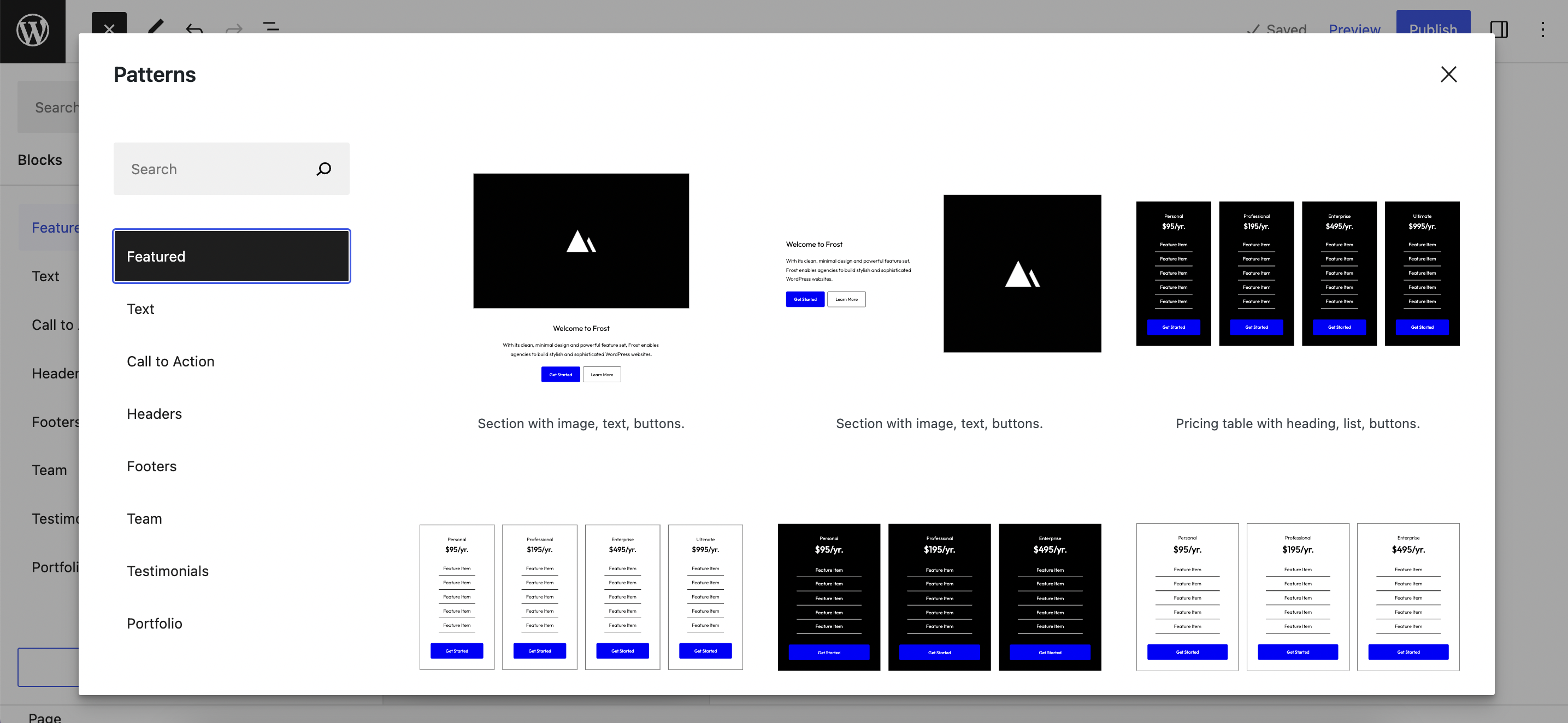 Frost includes 36 patterns for building everything from pricing tables to portfolios, calls-to-action, testimonials, a grid of team members, various heroes, feature boxes, and more. Many of them have dark and light variations.