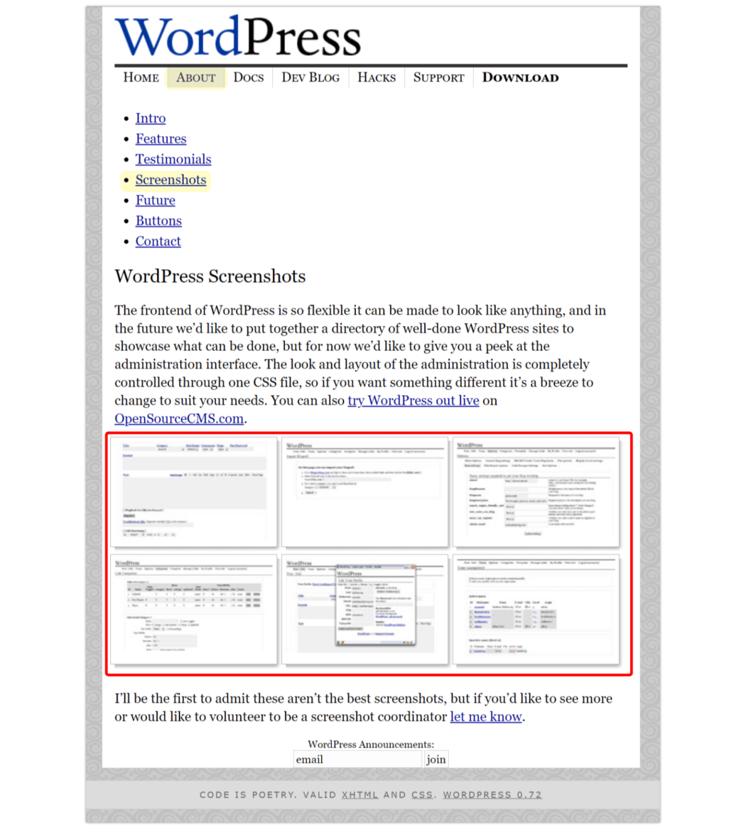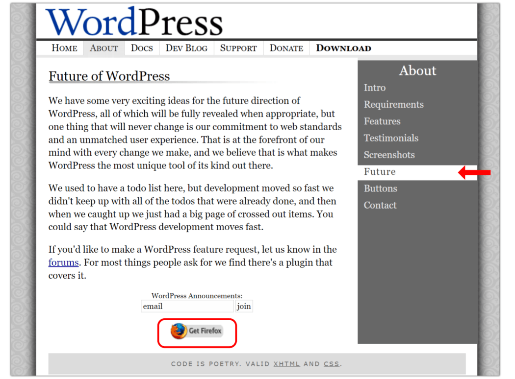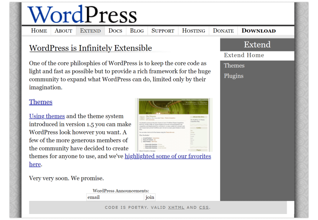 In the footer, the iconic “Code is Poetry” tagline, along with the WP version and valid code types (XHTML & CSS).