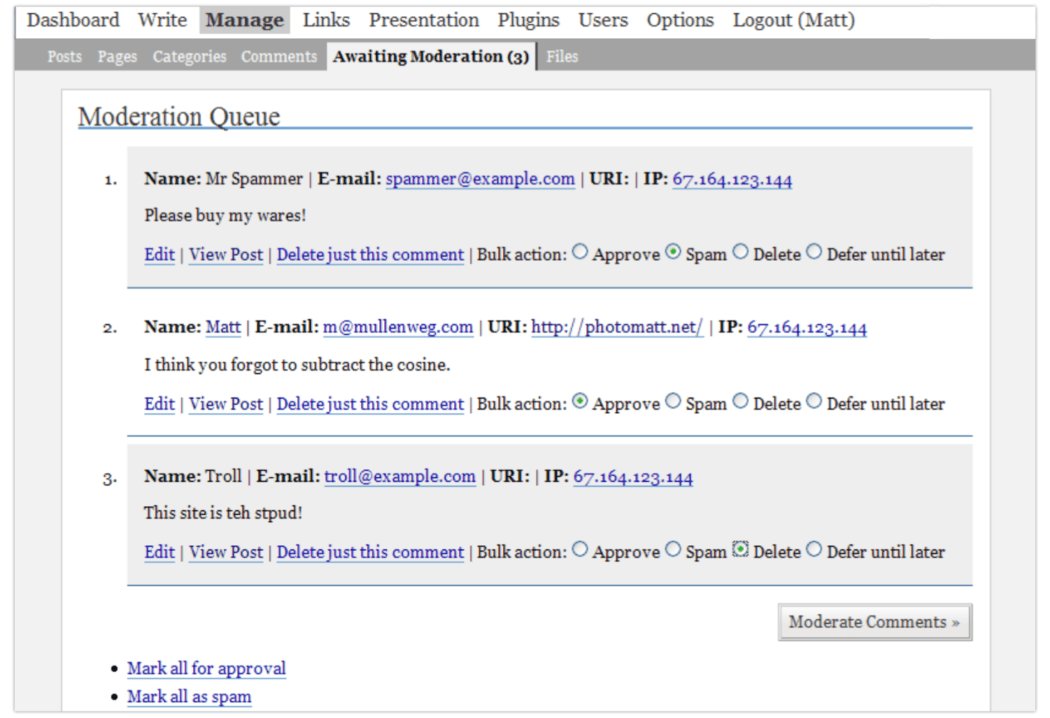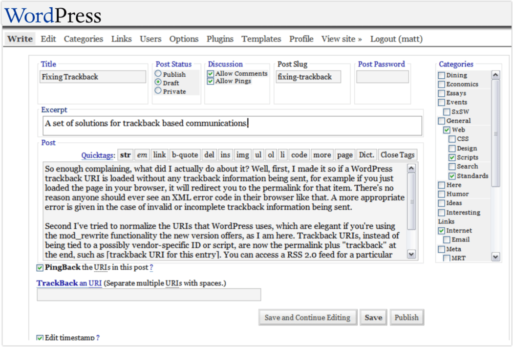 Screenshots > Editor” width=”1050″ height=”774″ />As the image above bears witness, categories, comments, quicktags, and pings were all there from the beginning.