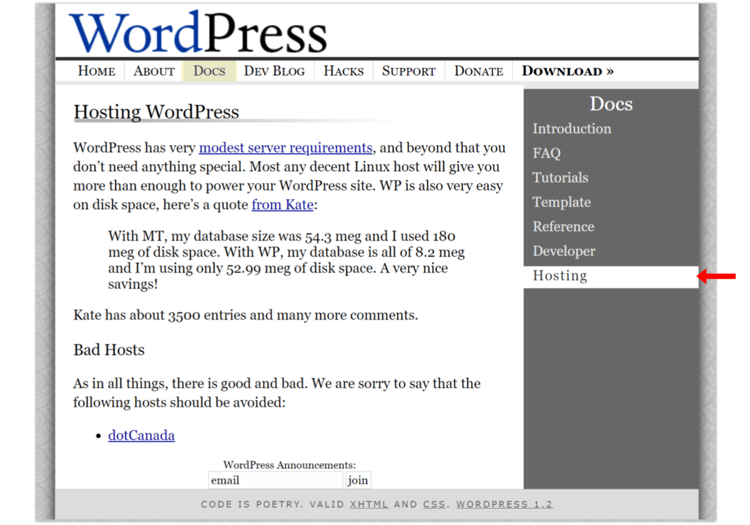 This is the first time we see an actual section devoted to Hosting. Interestingly, they don’t recommend any specific hosts at this point; instead, advise against one in particular, actually recommending to avoid them.