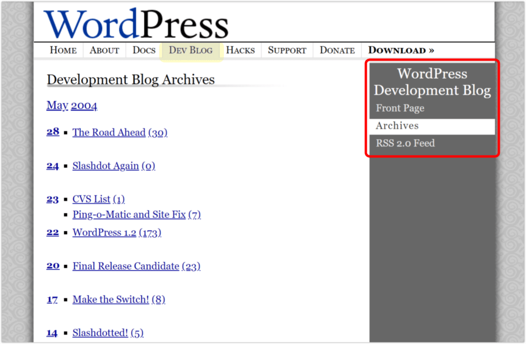 By the end of this year, the Blog section finally introduced additional sidebar menu sections. Recent Posts, Recent Comments, and Archives were added in addition to the well-established Categories. The archives started with the current month, and went all the way back to the OG, April 2003.