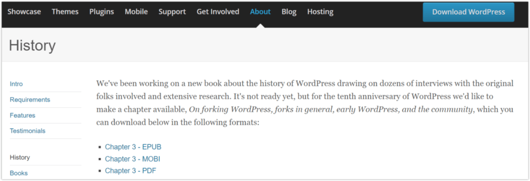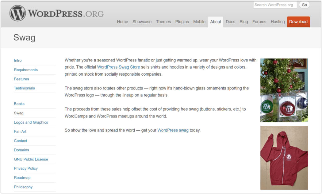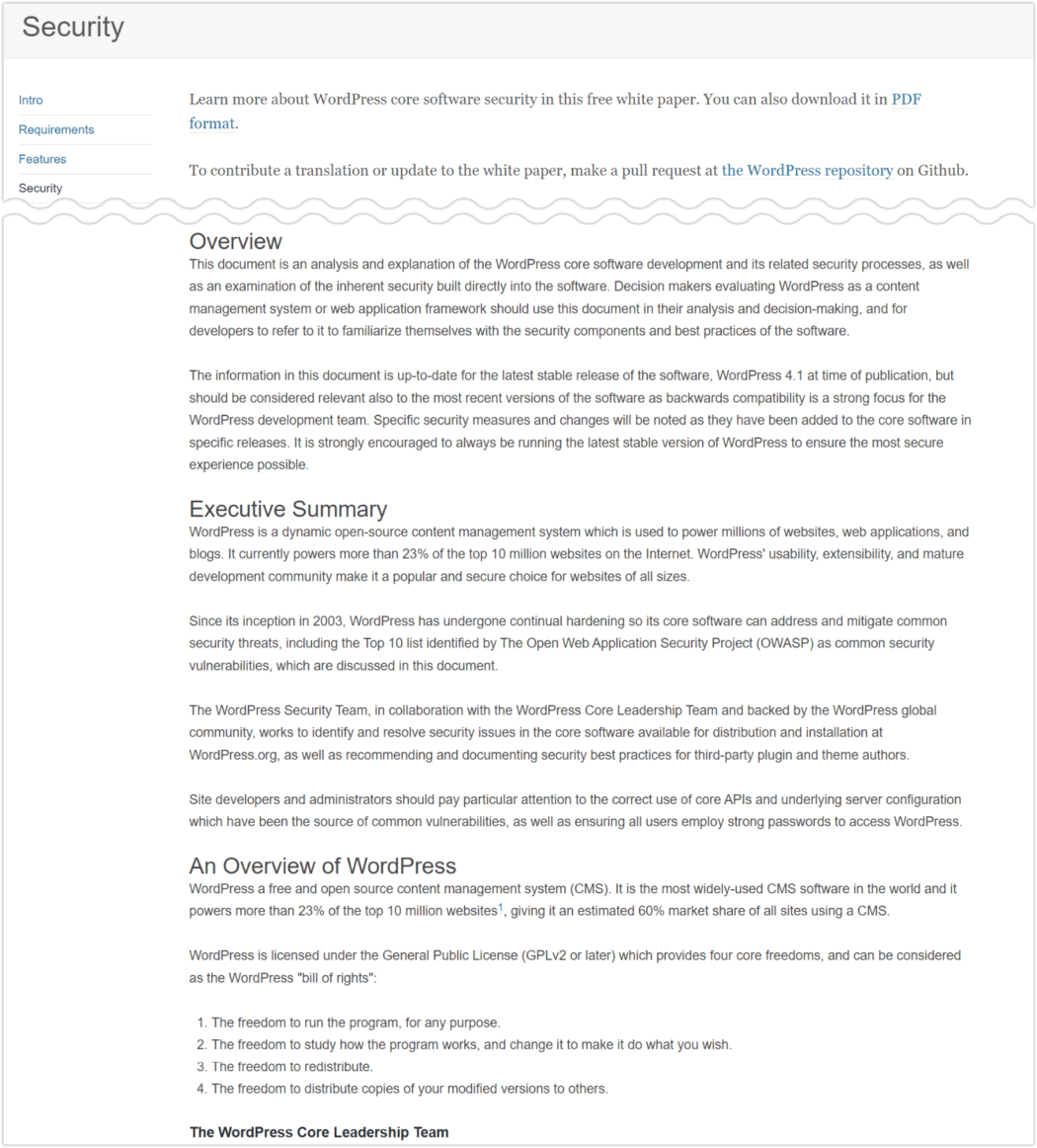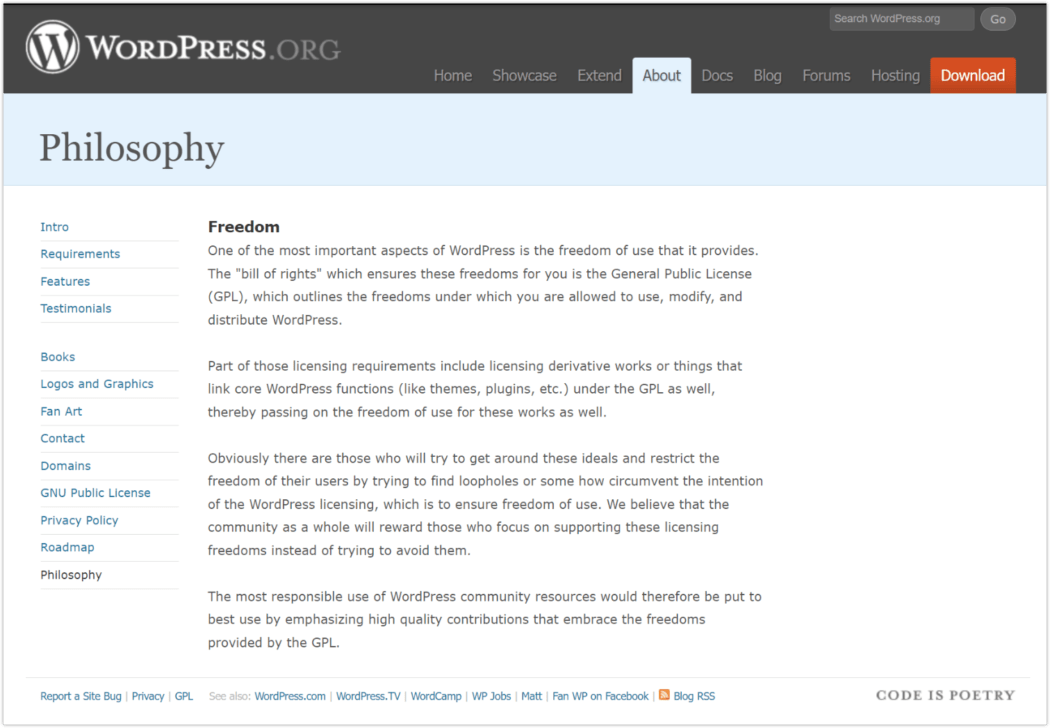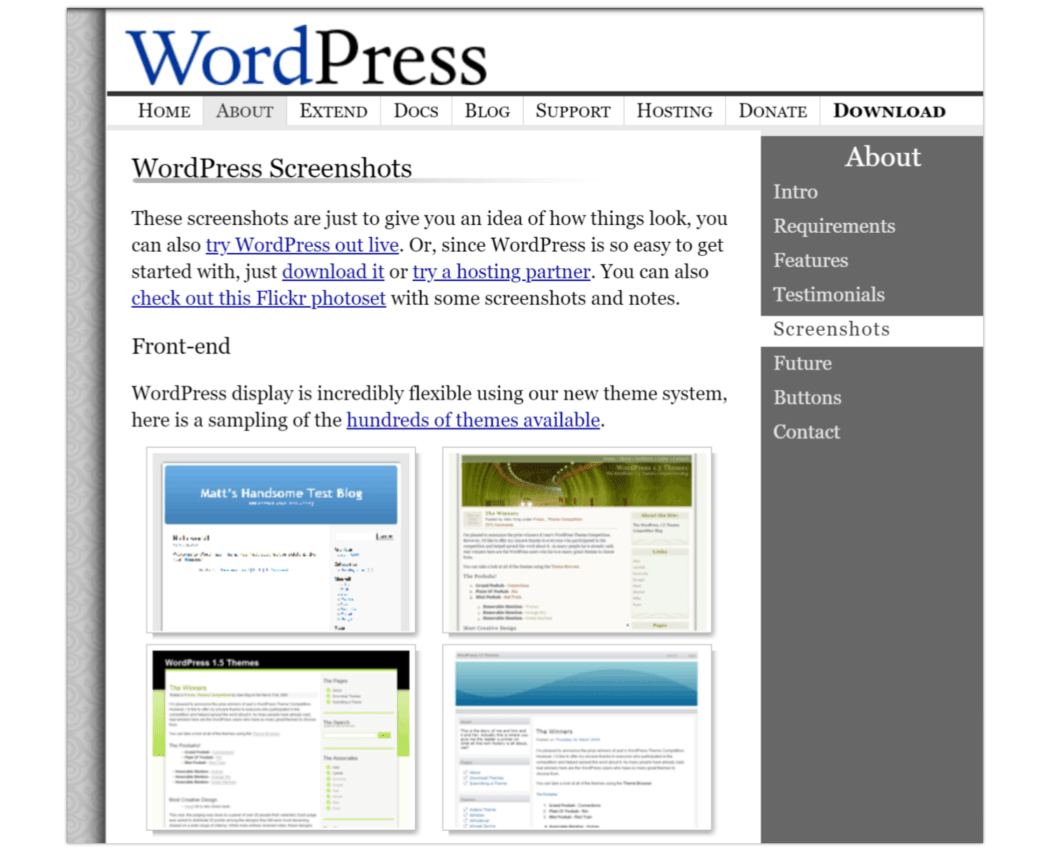 The main content here is split almost 50/50 between a description of what WordPress is, and the creatives behind it.