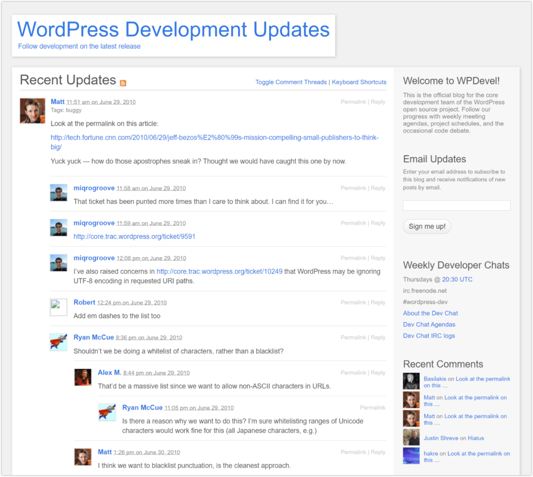 In this now-famous post, Matt lamented that the popular blogging platform b2/cafelog hadn’t been updated in a while, and proposed the idea of creating a fork from it, so it would “never be lost” and “free to the world”. First to comment was Mike, who voiced his interest in contributing.