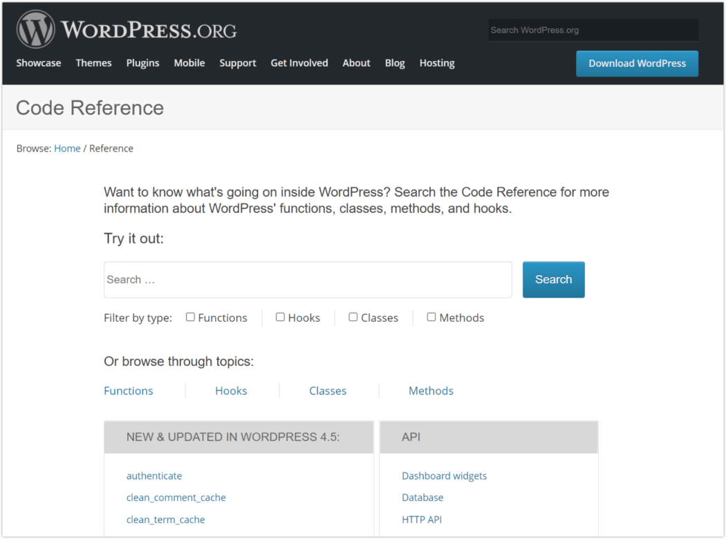 You could enter a search term here to get more information about WP functions, classes, methods, and hooks, or simply browse through listed topics.