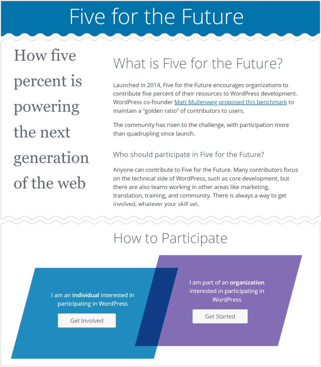 While it originated in 2014, this year the WordPress initiative “Five for the Future” got a big, splashy page of its own under Get Involved.