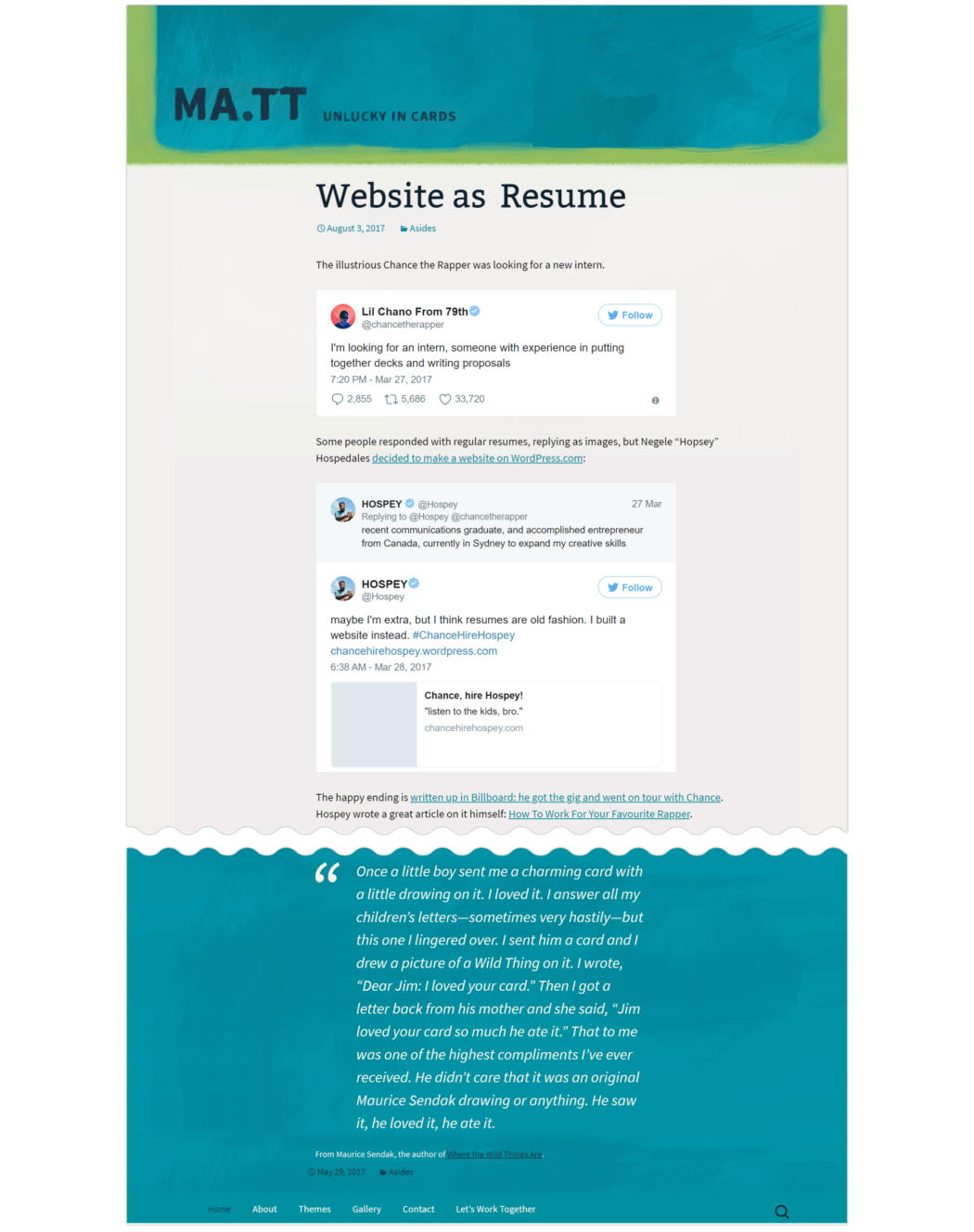 With a brand-new default theme as a canvas, and support for an ever-growing collection of blocks as brushes, it made it possible to paint with words, pictures, sound, or rich embedded media.