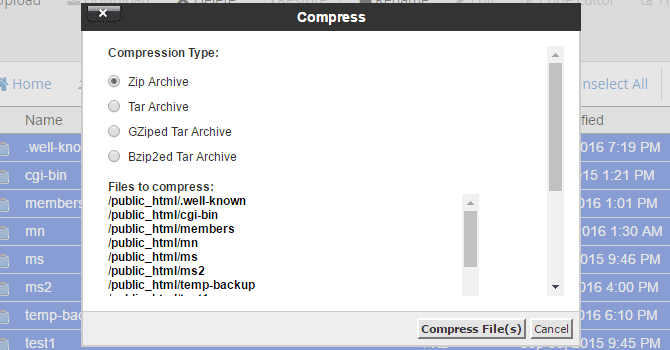 After logging into cPanel, go to File > File Manager, then go to the directory where your files are located. To create a full backup of your files, click the Select All button on the menu above your listed files, then click the Compress button at the top of the page.