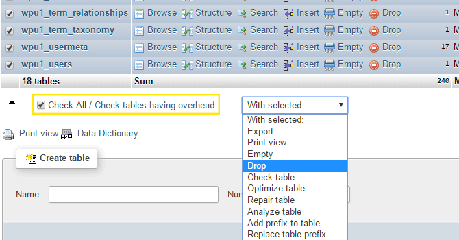 If you only want to restore a selection of tables that you backed up, check the boxes on the left of the tables and choose the ones you’re going to restore, then select Drop from the list at the bottom.