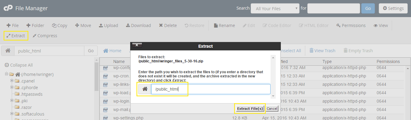 Next, click the Extract button at the top of the page. An inline pop-up should appear where you can choose the directory where you site’s files should be, then click Extract File(s).