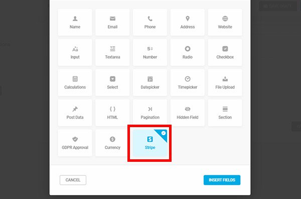 Click on the purple Insert Fields button and select the Stripe option.