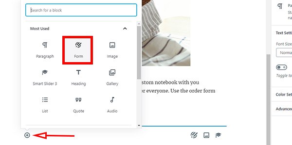 To place the order form at the bottom of your sales page, in your WordPress post/page editor, click the Plus icon and add a Form block.