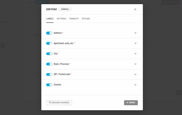 Once inserted, click on the Address row to open its field settings. In the Labels tab, you can activate or deactivate the different address subfields (they’re all enabled by default).