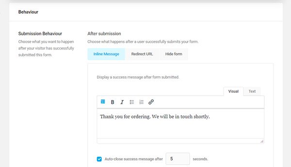 By default, the form will show an inline message that will close automatically within 5 seconds. Change the message here to better reflect an order form.