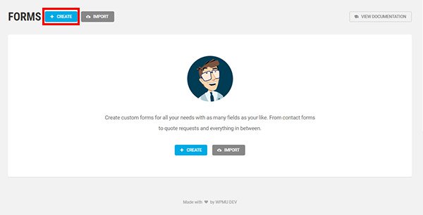 Go to Forminator > Forms and click either of the blue Create buttons to begin making your new form. You can also do the same directly from Forminator’s dashboard.