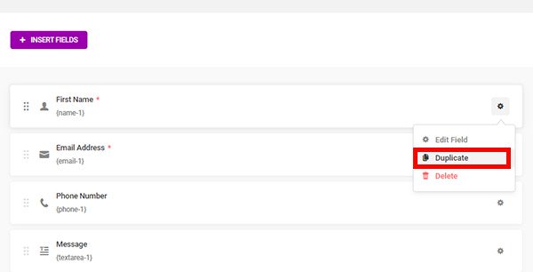 In the First Name field, click on the gear icon and select Duplicate. This is a faster way to insert multiple fields of the same type without accessing the Insert Fields menu repeatedly.