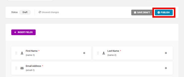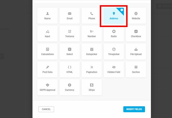 Next, click on the purple Insert Fields button. It should open a popup with all the field options you can add to the form. There’s also another Insert Fields link at the bottom of the form.