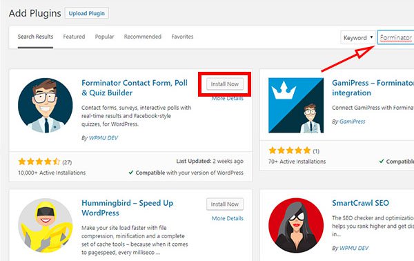 To install Forminator, just go to your WordPress Dashboard, and under Plugins, choose Add New and search for Forminator. Click the Install Now button and Activate the plugin after installation.