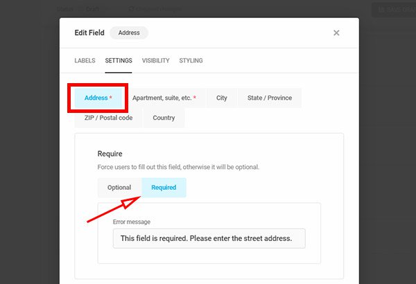 Underneath the Settings tab, mark all the address subfields as required since they’re essential to ship the product.