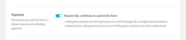 If you’re collecting payments, it’s highly recommended that you have the “Require SSL certificate to submit this form” option checked. It’ll enable your form to collect payments securely.