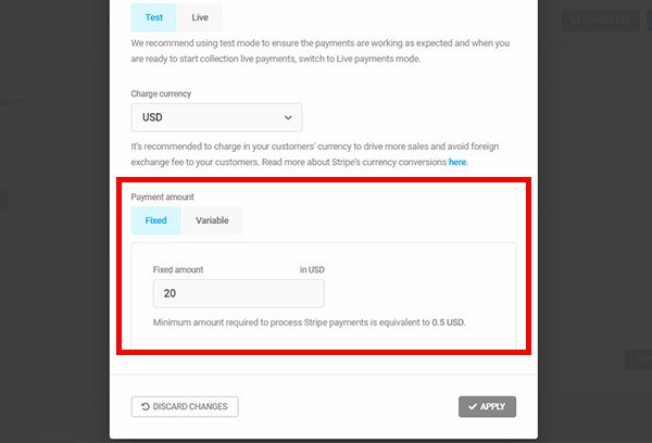 Once Stripe is configured, under the Stripe field settings, we need to set the payment amount. Since this is a single product with an all-inclusive price and no variations, we’ll select the Fixed payment option.