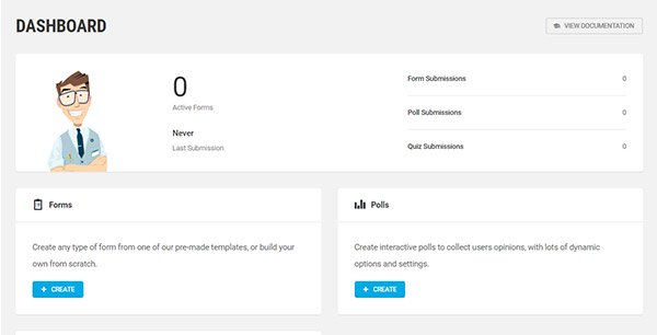 You won’t see any data here now, but as you start creating forms and collecting user entries, the dashboard will start populating with views, submissions, conversion rates, and other interesting data.
