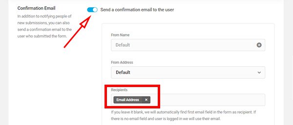 Make sure that the recipient here is set to Email Address, which is the label for the email address entered by a user in the form. For example, if a user enters username@gmail.com as their email address in the form, the order confirmation email will be sent to that address automatically.