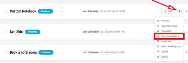 To view all of a form’s submissions, visit Forminator > Forms in your dashboard. Click on the gear icon and select View Submissions.