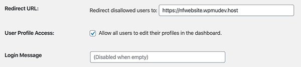 You can also input a redirect URL for disallowed users, allow all users to edit their profile, and also add a customized login message.