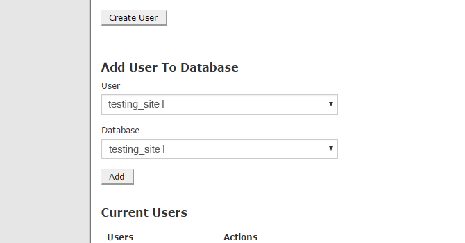 Scroll down to the Add User to Database area and select your username and database from the drop down lists, then click the Add button.